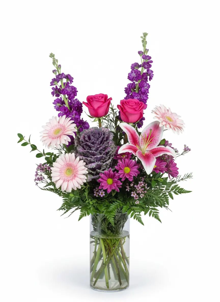 Celebrate life's beautiful moments with our stunning Berry Blooms! This vibrant bouquet bursts with hot pink roses, light pink gerbera daisies, and majestic stargazer lilies, creating an unforgettable display of joy. Perfect for brightening any space or sending a heartfelt message.
