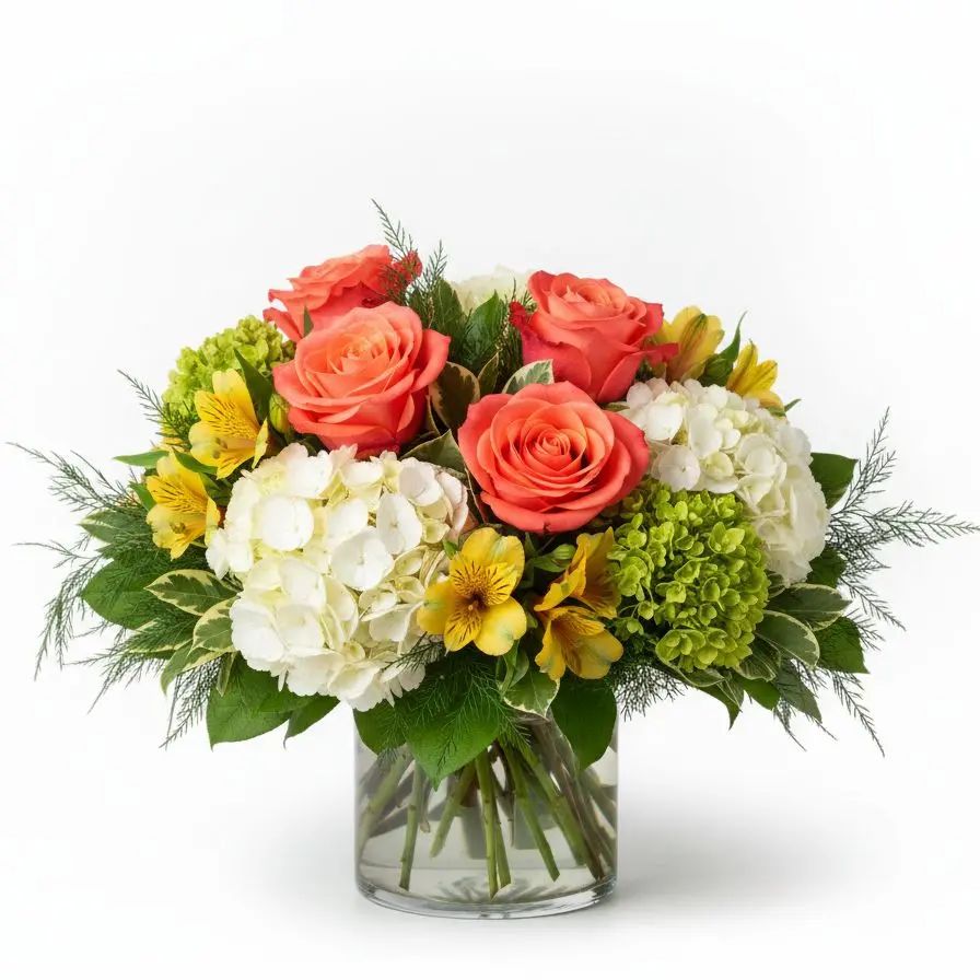Immerse yourself in the vibrant beauty of our Coral Crush Garden. This stunning arrangement bursts with the warm hues of coral and orange roses, bright yellow alstroemeria, and lush hydrangeas. It's a joyful celebration of nature's artistry, perfect for brightening any space.