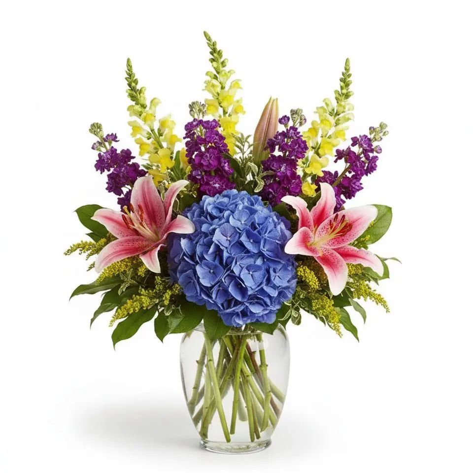 Experience the joy of a perfect garden party with our breathtaking Grandeur bouquet! Featuring a vibrant mix of blue hydrangeas, pink lilies, yellow snapdragons, and purple stock, this arrangement brings elegant charm to any celebration. Brighten your space and uplift spirits with this magnificent floral creation.