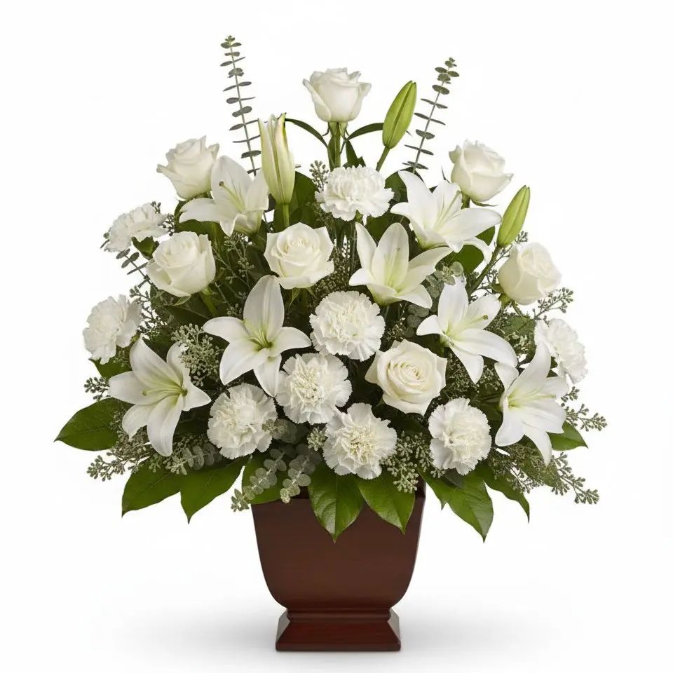 Celebrate the beauty of simplicity with our Pure Elegance, a stunning arrangement of pristine white lilies, roses, and carnations. Accented with lush eucalyptus, this bouquet radiates grace and serenity. It's the perfect choice to brighten any space or convey heartfelt sentiments.
