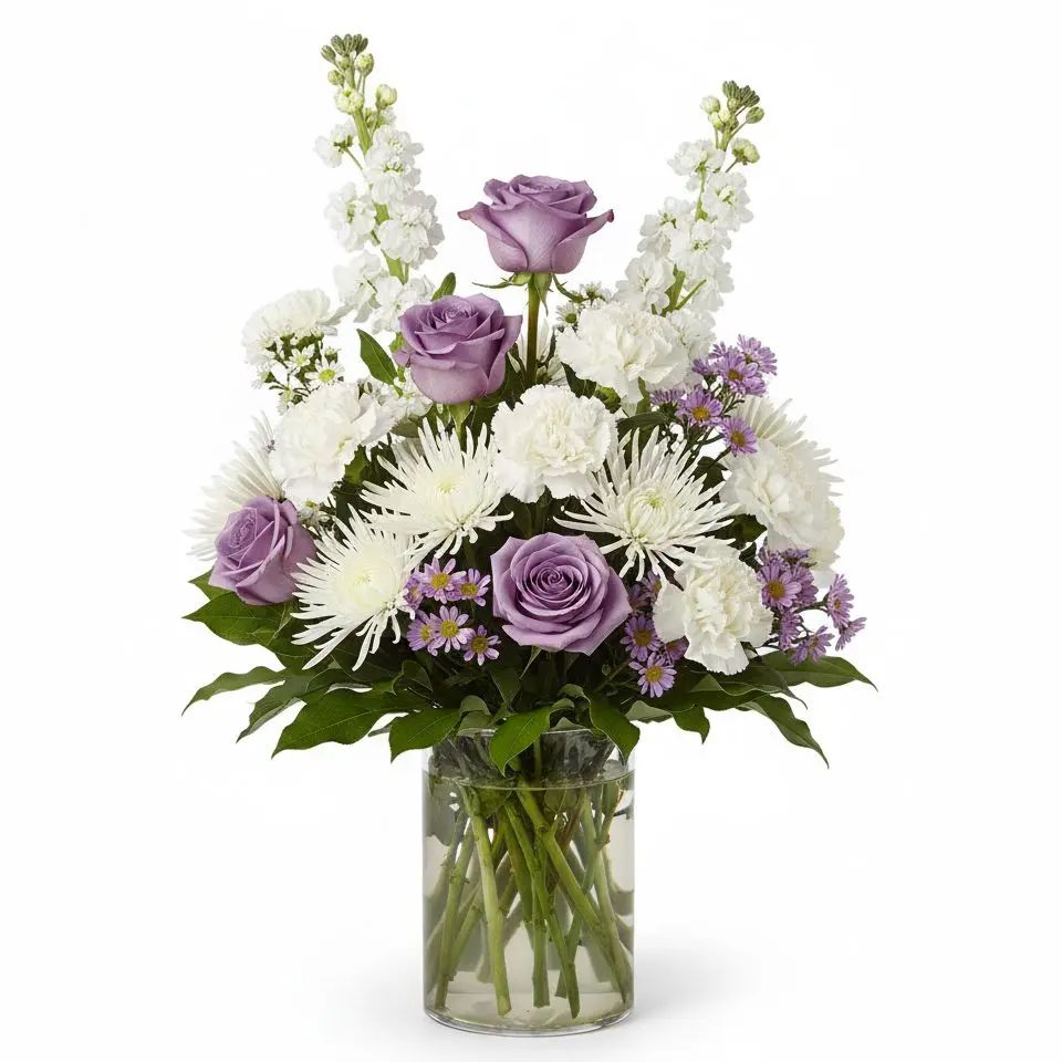 Experience the majestic beauty of our Regal Bloom, a stunning display of white stock, poms, spider mums, and carnations, beautifully contrasted with vibrant purple roses and aster. This exquisite bouquet brings elegance and joy to any setting, creating a truly unforgettable impression. Perfect for celebrating life's special moments or simply brightening someone's day.