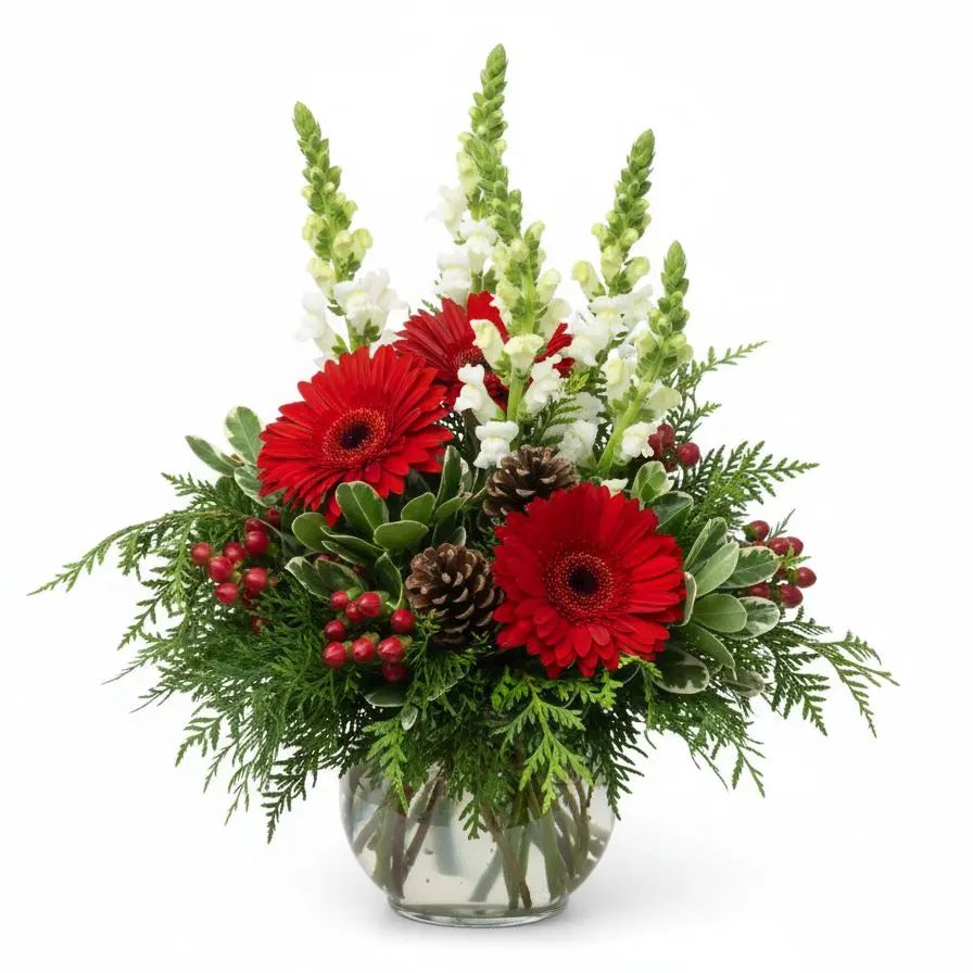 Celebrate the festive season with our 'Holiday Cheer' bouquet, a delightful arrangement bursting with vibrant red gerbera daisies and hypericum alongside crisp white snapdragons. Lush green arborvitae, pittosporum, and tree fern create a beautiful backdrop, accented by charming pine cones. This heartwarming floral display is perfect for spreading joy and holiday spirit in any home.